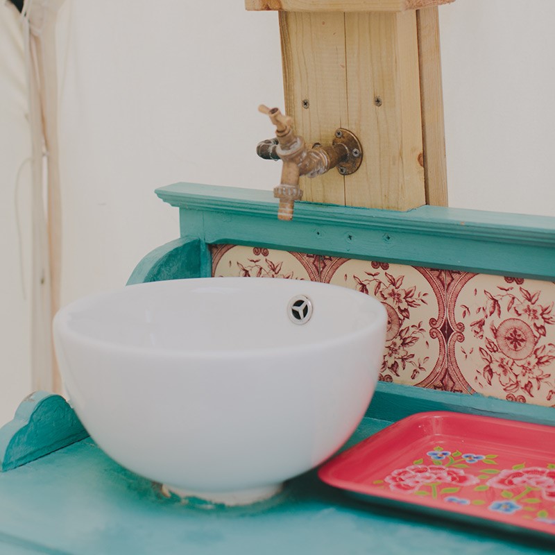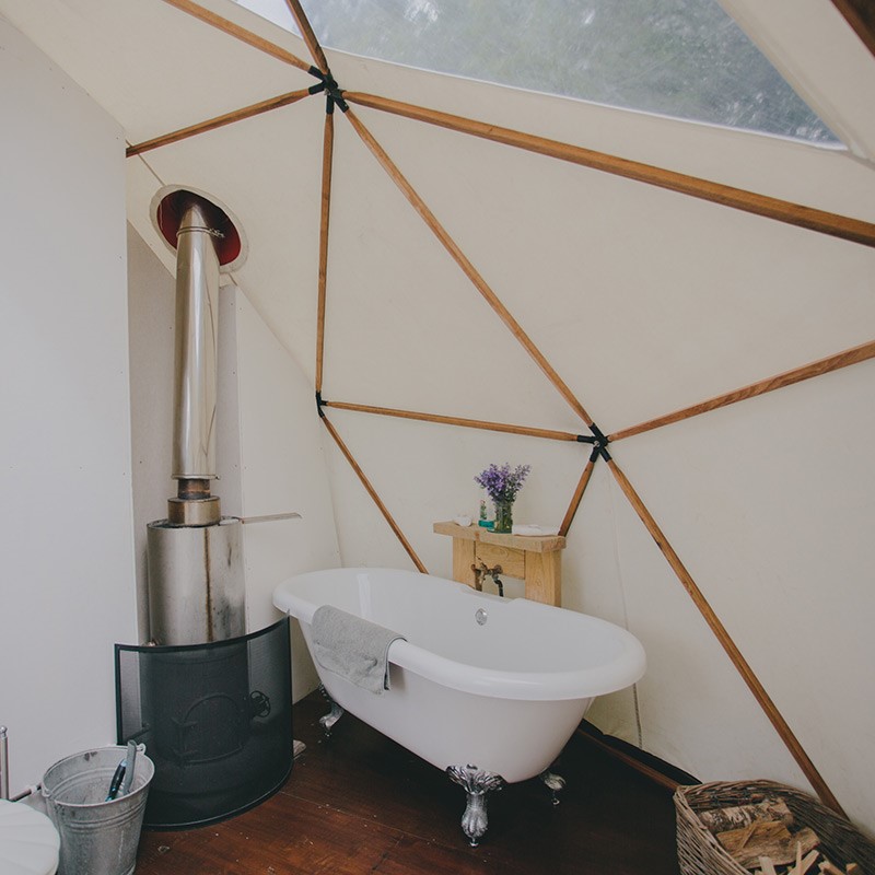 The main dome has been thoughtfully furnished with a large - and very comfortable - king-size bed, snuggly duvet and wood-burning stove to keep you cosy under canvas. The second dome has been divided (by a wooden wall) into a fully-equipped kitchen and a bathroom, which has a flushing loo and freestanding bath - a wood-burning stove heats up the water for that all-important candlelit soak.